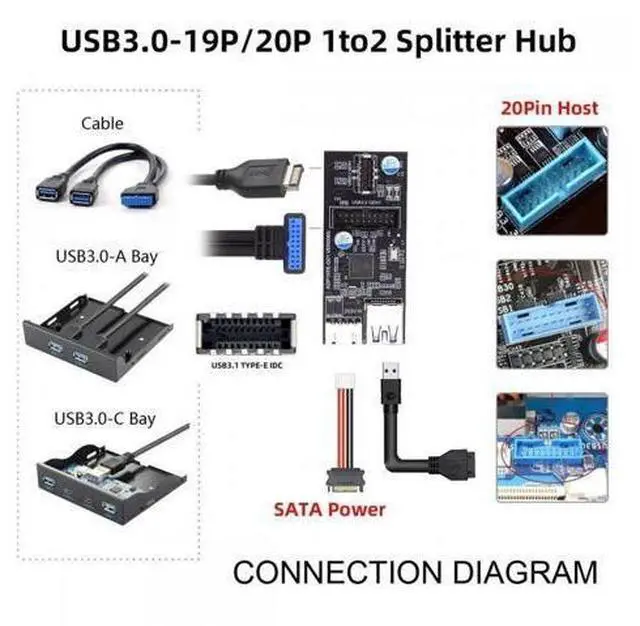 Type-C USB-C 19/20Pin Header to USB 3.0 20Pin Type-E Dual Ports Female PCBA Type Adapter Splitter HUB 5Gbps With this adapter, you can directly connector motherboard Type-C orusb 3.020 pin socket, converted to dual usb 3.0 20pin Type-Esocket. Very easy to useType-C orUSB 3.0 data cable connected to the front panel of USB 3.0.