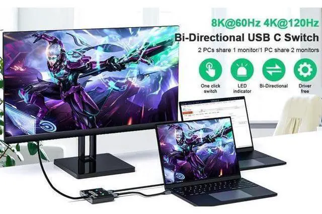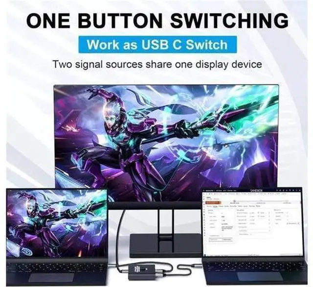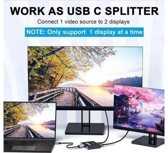 Data Transfer Description: 8K USB C Switch allows connect two USB-C sources like laptop, Macbook etc, to a single USB-C display. Besides, it also can switch one signal source to two displays(just like 1*2 splitter, but it is different that the 2 displays can not work at the same time).