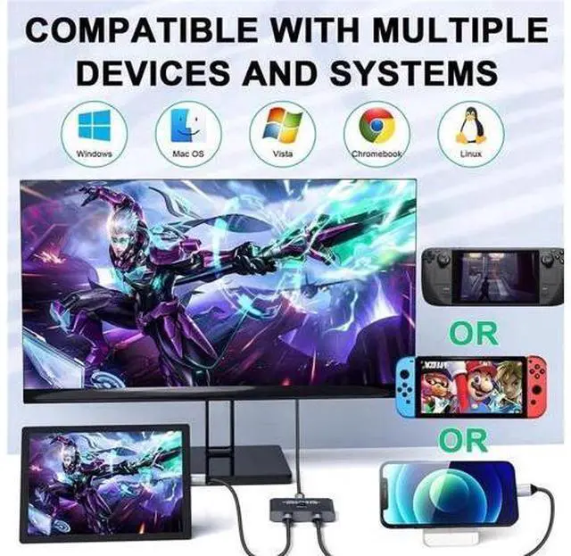 Video Output: You can output max 8K@60Hz 4K@120Hz 1080P@165Hz via our USB C Switch/Splitter to your USB-C or HDMI Displays. Support ultra-wide screen output (3440x1440@144Hz, etc. ). The Maximum resolution and refresh rate of your output depends on your Source device, monitor, USB C Dock, and cables.