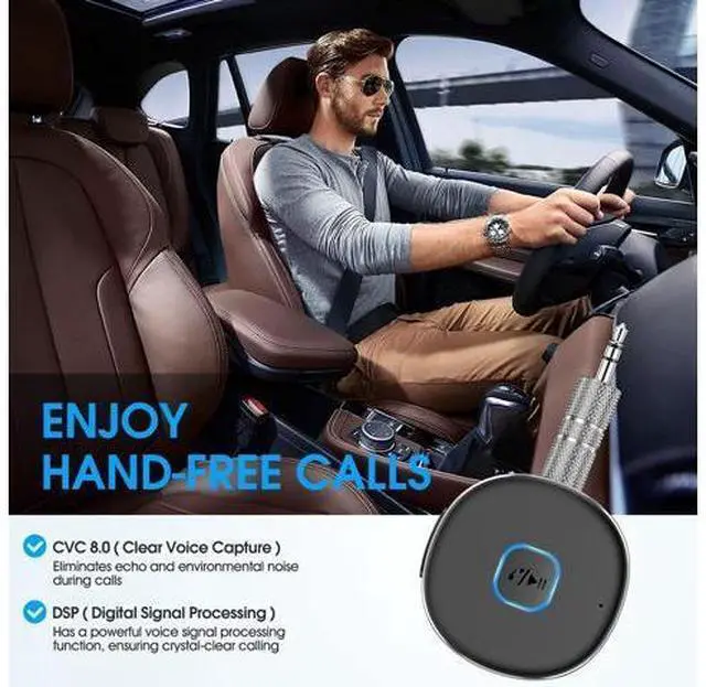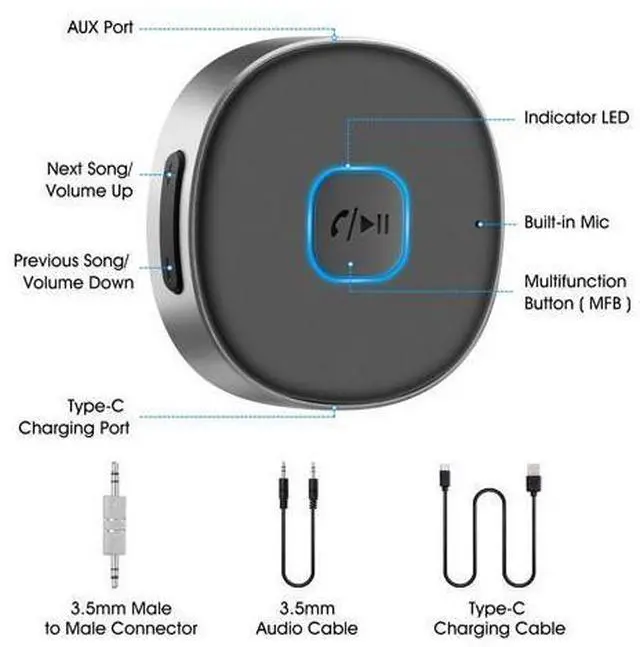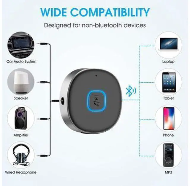 Bluetooth Range: Greater than 33ft Easy to Use Universal 3.5 mm audio jack design Multi-function button for Play/Pause and one-click answering +/ - button for volume adjustment and Next/ Previous track Longer Battery Life 2 hours fast charging and 16 hours working time, which means you can enjoy music and calling for almost the entire day before next recharge. Your long road trips will never be boring. Latest Bluetooth Technology Bluetooth V 5.0 with low power consumption, compatible with IOS and Android devices. The built-in microphone can be used to answer hands-free calls. Pair with mobile phone/MP3/ Tablet, etc. and turn your old car stereo/home stereo/3. 5mm wired headphones into wireless. Battery Indicator Once the wireless receiver has successfully paired with the phone, its power will be displayed on the phone to know its usage time.