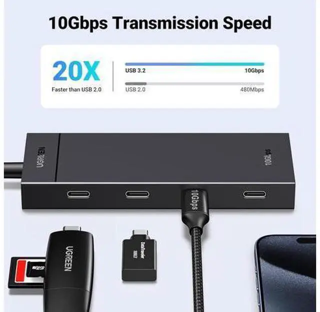 Data Transfer: The 4 Ports USB C 3.2 hub supports up to 10Gbps data transfer speed. That' s fast enough to transfer a 20 GB file in just 16.4 seconds, greatly saving your waiting time.
