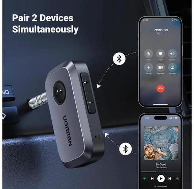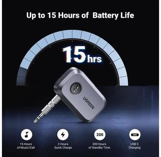 Bluetooth Chip: UGREEN aux bluetooth adapter for car uses the latest Bluetooth 5.4 chip, aming to provide faster transmission speed, higher reliability, stability and lower power consumption; offering clear calls, super Low static noise and CD sound quality. Product information Special Feature Hands-free Calling, Noise Cancellation, Intelligent Noise Reduction, Bluetooth 5.4, Auxiliary Bluetooth Adapter, 3.5 mm AUX Port, Navigation, Long Battery Life, Built-in Mic, Bluetooth to Aux, Car Audio Adapter Brand UGREEN Connectivity Technology Bluetooth Power Source Battery Powered Material Plastic Product Dimensions 2.24 x 1.1 x 0.51 inches Item Weight 2.89 ounces Item model number 35054 Batteries 1 Lithium Metal batteries required. (included) Date First Available September 13, 2023 Manufacturer UGREEN GROUP LIMITED Additional Features What can I do if the adapter cannot boot? The adapter might temporarily turn off or be difficult to turn on in cold conditions. You can recharge it or just use a hair dryer to blow it for 1-2 minutes via the hot air, and then turn it on.