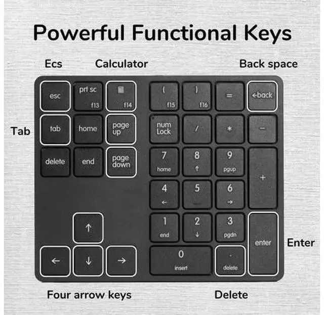 Keys Numeric Keypad: It includes commonly used digital processing functions; The extended 34-key numeric keypad also incorporates essential keys such as Esc, Tab, Back Space, Delete, Home, End, and four arrow direction keys ^^