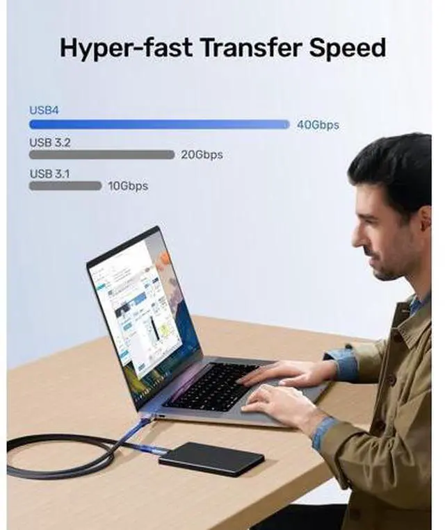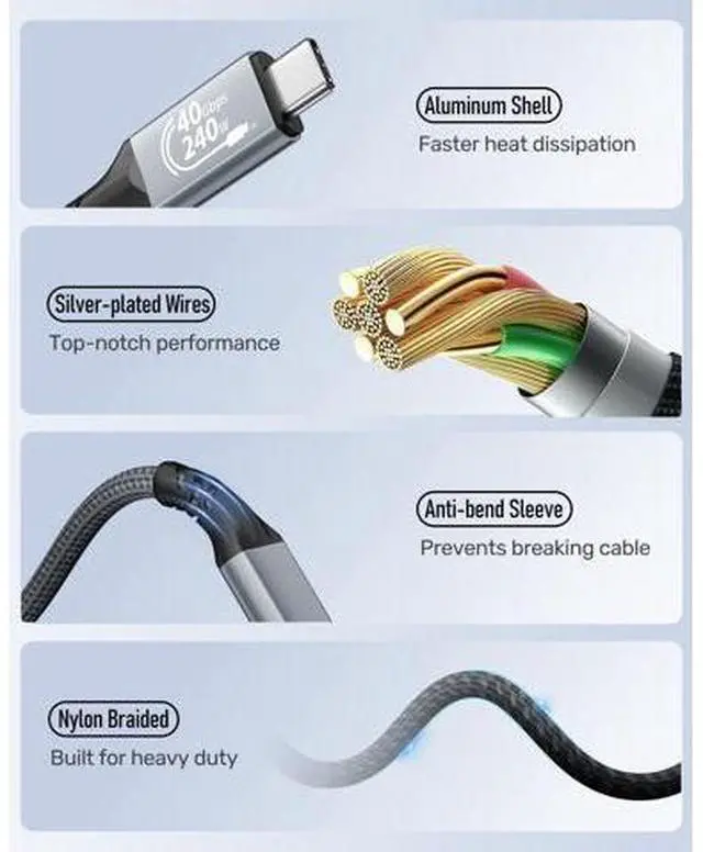 40Gbps Data TransferAGFINEST USB C to USB C Cable supports 40Gbps* high-speed transmission, allowing you to move photos, 4K videos, and large projects in seconds. (*Speeds vary by devices) ^^ 240W Fast ChargingWith PD 240W fast charging, this USB4 for Thunderbolt cable ensures your devices are charged quickly and efficiently. Say goodbye to long charging times and keep your devices powered up on the go. ^^ 8K@60Hz ResolutionExperience stunning 8K@60Hz or 4K@144Hz audio and video synchronization with this video cable. It's ideal for high-resolution displays and professional video editing. ^^ Multi-Screen ExpansionPerfect for professionals and gamers alike, this USB4 data cable supports multi-screen expansion.