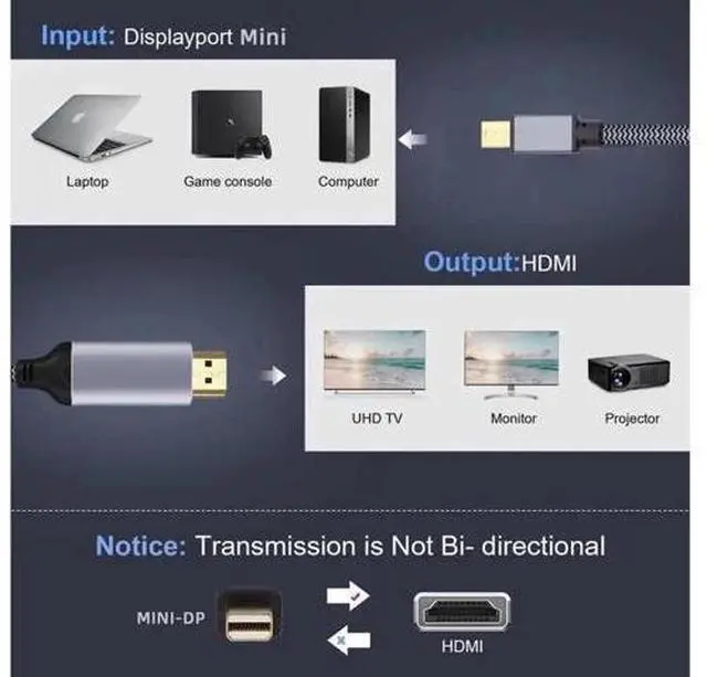Mini DisplayPort 1.4 Source to HDMI 2.0 Display 8K 60hz UHD 4K MINI-DP to HDMI Male Monitor Cable This is a 8K MINI DisplayPort to HDMI cable, Not support HDMI to MINI DP. It is not Bi-directional. MINI DP x HDMI cable supports 8K@60Hz, 4K@60Hz for MINI DisplayPort Enabled Desktops and Laptops to Connect to HDMI Displays, enjoy home theater with 8K/4K high resolution. MINI Displayport Male to HDMI male cable with Slim Aluminum Shell transmits high-definition video and audio from your computer to an HDTV for video streaming or gaming. Gold-plated MINI-DP to hdmi monitor cable Video 8K, 4K UHD 2160p, HD 1080p, aluminum slim case, all of them ensure a strength connectivity between devices; With 8K/4K MINI DP to HDMI cable under mirror mode, extend mode.