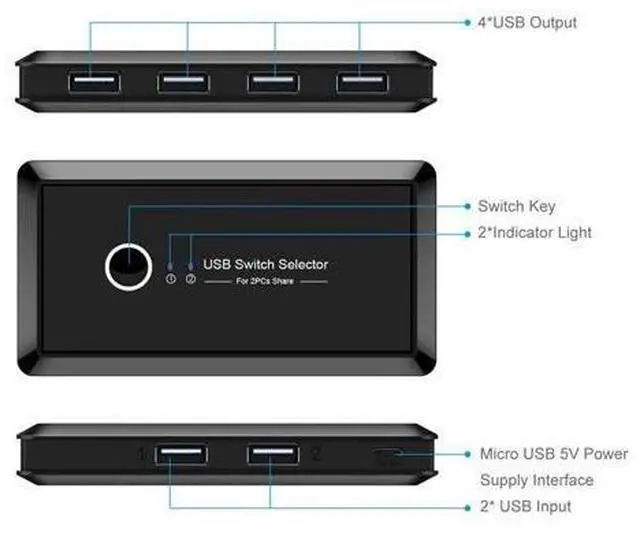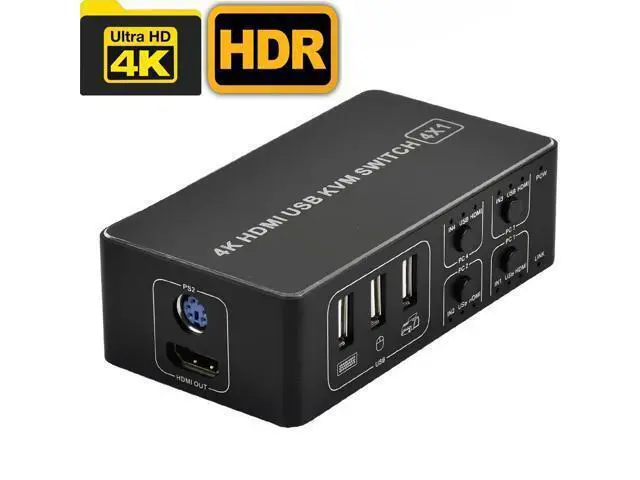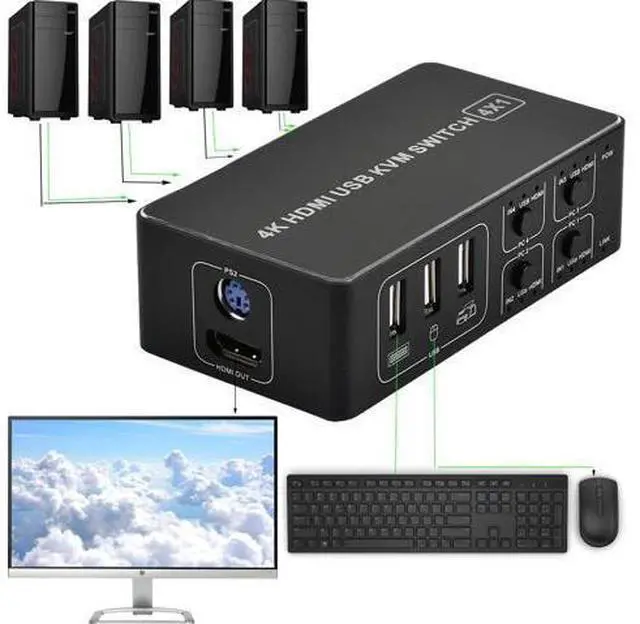 HDTV) Features&specifications: Using only 1 set of keyboard, mouse and monitor to control 4 PCs Support Windows/Mac OS Support hot plug, connect or disconnect devices to the KVM switch without turning off devices Support resolution up to 3840*2160@60Hz Supports button control or the included extension switch wire With extra standard USB port, it is possible to connect bar code scanner, USB hard drive or other USB devices to KVM just as you have plug these devices directly to computer What is Included 4K KVM Switcher X1 USB cable X4 USB DC power cable X1 extension wire control cableX1