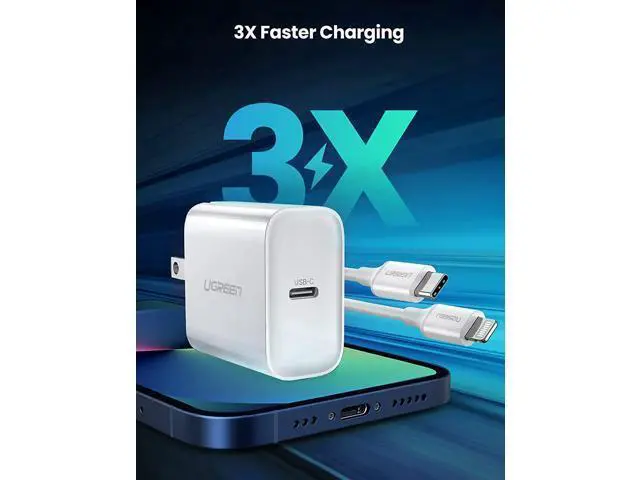UGREEN USB C Charger with 3FT MFi Certified USB-C to Lightning Cable -- Bring Your Device Back to Life Quickly If youve ever scrambled out the door with your phones battery in the red, you know that power is precious, and the faster you can get it, the better. Dont let a dead battery get your spirits down, a compatible fast charger will be able to add a decent amount of charge in a short period of time, that's why the UGREEN charger set is an ideal choice. Less Time Charging for New iPhone Charge iPhone 13 and other iPhone devices, UGREEN USB C wall charger can reach up to 3X faster than with an original 5W Charger.