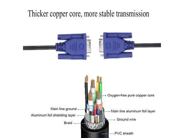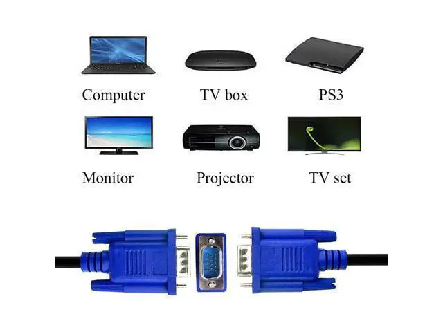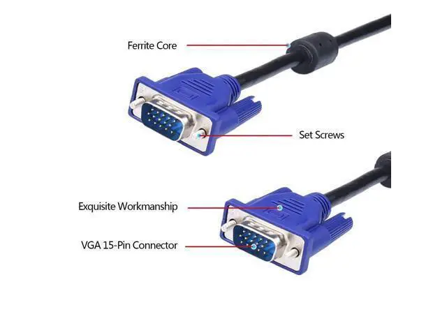 Excellent QualityPremium VGA/SVGA/XGA/SXGA/UXGA Monitor CableVGA Cable 5Ft HD15 Male to Male VGA Video Cable ^^ Powerful FunctionHeavy-Duty Coax style cabling delivers ultra-high performance. Black extension cord and blue interface. ^^ Excellent MaterialThe plugs and the wire are made of premium material, the cable outer cover is made of PE material, which has a good ductility, anti-interference and heat resistance ^^ Easy to InstallThis VGA cable has a length of 1.5 meters / 5 feet, Extended HD15 male-to-male VGA video for your monitor. ^^ Widely UsedConnects PC or laptop to the projector, LCD monitor, and other video display system through VGA connections