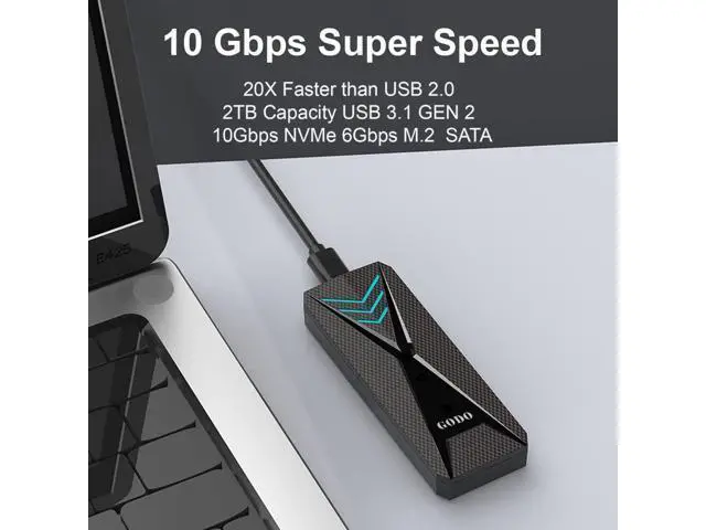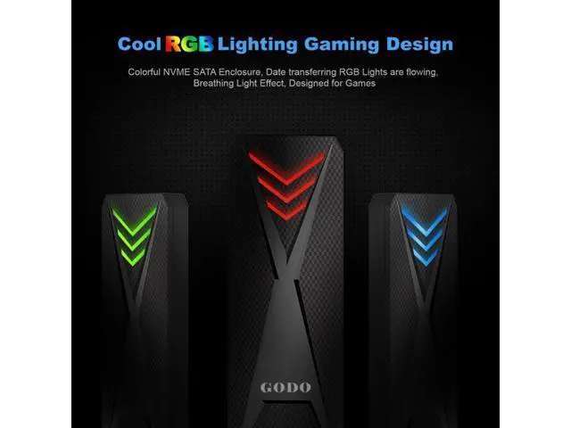 2 nvme sata enclosure: M. 2 enclosure up to 10 Gbps high speed M. 2 Nvme 6Gbps speed M. 2 SATA though USB 3.1 Gen 2, perfect solution for data transfer and data backup. One HD movie transfer only takes 2-5 seconds. ^^ Cool RGB Gaming DesignThis RGB m. 2 nvme enclosure/m. 2 to sata adapter has more color atmosphere. The red, green and blue are alternately switched slowly during standby; It flashes quickly during reading and writing. The blue light breathes and flashes during sleep. The red light is always on when the SSD is not installed. Working status at a glance. ^^ Tool-Free DesignGODO M. 2 sata/nvme ssd enclosure rgb allows quick and easy installation of your M. 2 SSDs. Plug and play, no driver needed. Compact and portable for easy carrying while on the go.