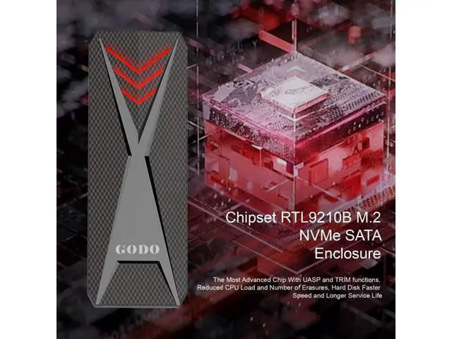 Chipset RTL9210BGODO portable RGB M. 2 NVMe/SATA SSD Enclosure is specially designed for M-Key/(B+M) Key NVMe PCIe based SSD up to 2TB. Also Support SATA M. 2 SSD Size 2230/2242/2260/2280. Offering an easy way to connect M. 2 SSD with your USB-C (Thunderbolt 3 Compatible) laptops for file backup, disk upgrade, clone, data recovery and storage expansion. ^^ Super Speed TransmissionM.