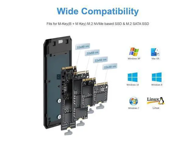 NVMe SSDs in sizes: 2230/2242/2260/2280. Support Multi OS, Windows2000 / XP / VISTA/7/8/10, Mac OS 9. X and Linux 2.4. 2.