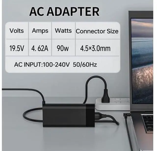• Max output: 19.5v 4.62a 90w power supply; connector size: 4.5mm 3.0mm blue tip