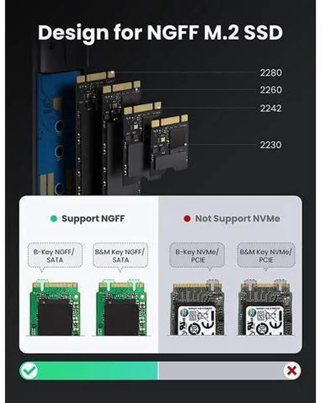 2 SATA Enclosure:? Does not support NVMe PCIe based M-Key and M&B-Key M. 2 SSD, M. 2 PCIe AHCI SSD, mSATA SSD.? UGREEN M. 2 SSD Enclosure is specially designed for B-Key & M+B Key SATA NGFF based SSD, including the size of 2280/2260/2242/2230 up to 2TB. Offering an easy way to connect M. 2 SATA SSD with USB-A computers, PS4, Xbox or USB-C laptops, tablets for ultra-fast data transmission, storage expansion, file back-up, data recovery, system upgrade, disk cloning.