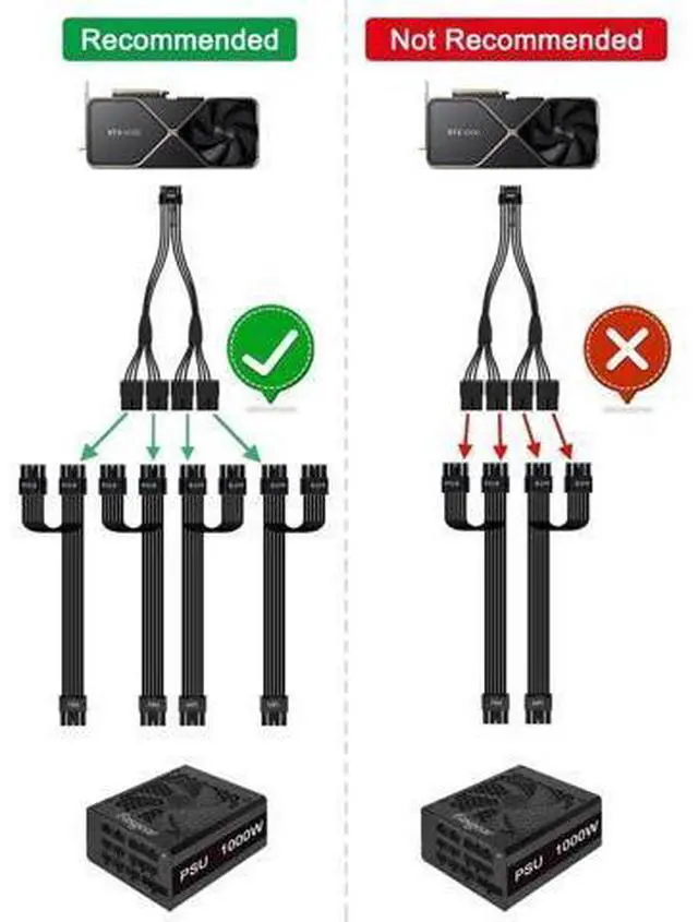 Note: 1. This cable is only suitable for RTX 3090Ti / 4080 / 4090 Series. 2. Do not recommend you DIY our power cord. Using an incorrect way to remove the pins may cause the pinout to deform and be unable to the original state. That will lead to poor contact. 3. Don't use PSU 8 Pin to Dual 6+2 Pin PCIE Power Cable as two connecting ports to avoid overload power issue. We do recommend to use 4 pcs PCIE power cables to get better and more steady performance.