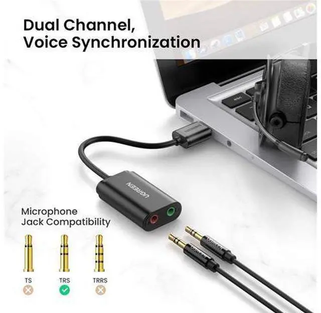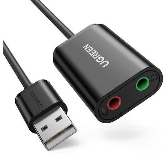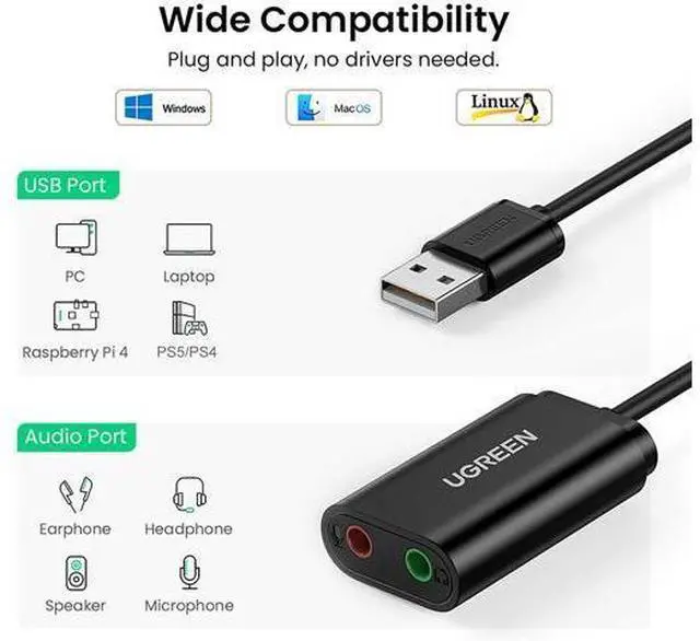 Ideal Sound Card Option: UGREEN usb audio adapter is ideal to replace your faulty sound card or audio port, it adds a mono microphone-in and a stereo audio-out port to your computer through a USB port, which enables you to connect your existing headphones, headset, speakers, or microphone with 3.5 mm jack to your PC through a USB interface.