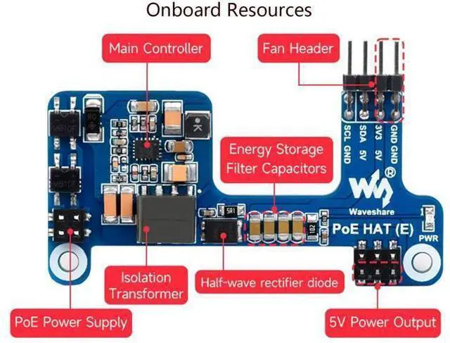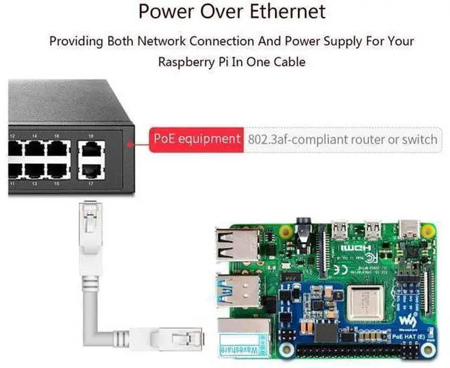OverviewThe PoE HAT (E) is a mini 802.3 af-compliant Power Over Ethernet accessory for the Raspberry Pi 3B+/4B. By using this small HAT and some proper 802.3 af-compliant power sourcing equipments, it is possible to provide both network connection and power supply for your Raspberry Pi in only one Ethernet cable. FeatureSuitable for the Raspberry Pi 3B+/4B, it can be used with the official Raspberry Pi case without taking up more spacePoE (Power Over Ethernet) capability, IEEE 802.3 af-compliantFully isolated switched-mode power supply (SMPS) Smaller and more flexible with a more compact component layoutSpecificationsPOE