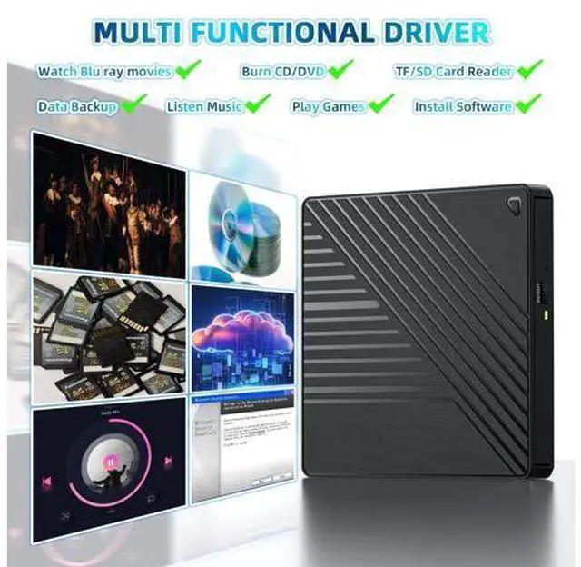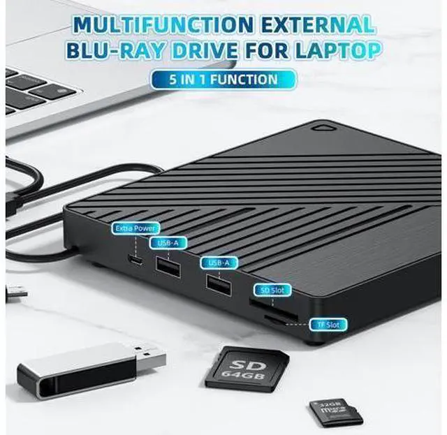 All-in-One Blu-ray Drive & USB Hub Enjoy Blu-ray/DVD/CD playback and 6X faster burning, plus 2 USB-A ports, SD/TF card slots for seamless file transfers and multi-device connectivity