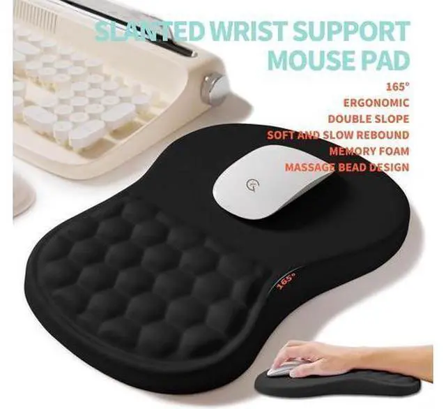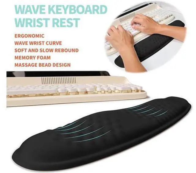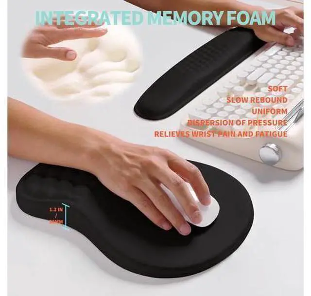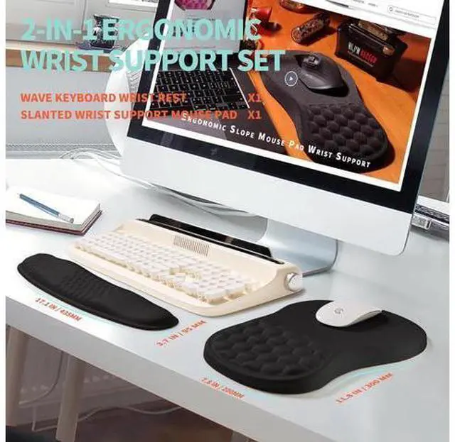 2-in-1 SetIt includes keyboard wrist rest ( 17.1 x 3.7 inch 435x95mm) and mouse pad wrist support ( 11.8 x 7.9 inch 300x200mm) ergonomic wrist curve massage bead design resulting in a more natural shoulder positioncushioned palm rest with memory foam gives you more wrist support all day longAngle and MassageThe innovative 165 double slope combined with massage bead support effectively relieves wrist pain and fatigue improves carpal tunnel syndrome (CTS) enhances air circulation between the wrist and mouse pad keeps the wrist in the most comfortable statWave Undulating Massage SlopeAdjusting the height difference between the wrist and keyboard places your hands wrists and forearms in a natural typing position Massage convex stimulation avoiding joint and wrist fatigue and relieving pressure on the elbows and shoulders during prolonged use of the computerHigh-density Polyester FabricSmooth wear-resistant non pilling high-density fabric suitable for fast cursor movement and precise positioning.
