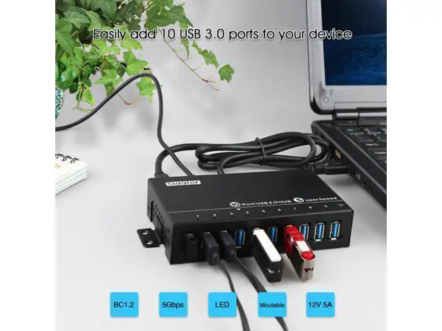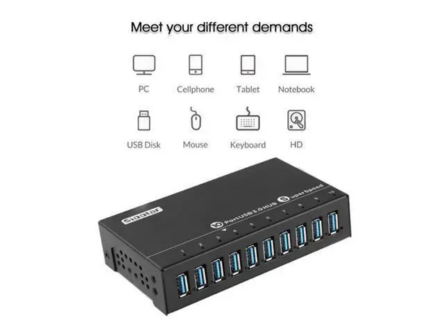 Support system: Windows XPVista7W2000 Mac 9.110. 2 etc SIPOLAR Multi 10 Ports Metal USB 3.0 Splitters Charger Hub with Power Adapter 2-in-1 Data and Charging for Phone EU Plug 1. Industrial grade 10 ports USB hub, full metal material quality, support 10pcs devices connection at the same time. 2. Support USB 3.0 data syncs transfer rate up to 5Gbps. Connect USB devices such as external storage, phone, tablets, digital cameras, printers, and more industrial devices. 3. External 12V5A power adapter, the output of each port reach 5V 1A, charging for mobile phone iPad etc. Compatible with BC 1.2 agreement. It is with the bracket mount can be installed on the desk and wall. 4. It's made of aluminum alloy case, fast heat dissipation and high temperature resistance. with mounting bracket, can be installed on the wall or desk, with LED indicator lights, over current protection, Over-voltage, Short circuit protection. 5.