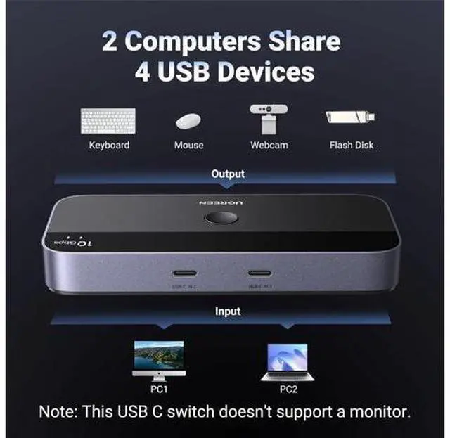 Input Tip: This is a USB C switch not a KVM switch and doesn't support a monitor; the USB-C input does not support video and there is no HDMI input. This device is designed for data transmission and does not support video transmission.