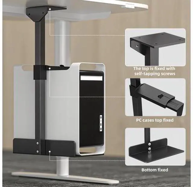 Under the Desk or On the Wall Mount PC Cases HolderInstall your computer case under the table or on the wall beside the table. This way, you can enjoy a more comfortable legroom and keep the area under your table looking neat and tidy. The stand suspends your PC cases under the table, protecting it from kicks or bumps and also enhancing the cooling speed.