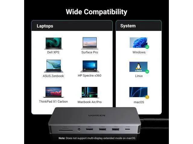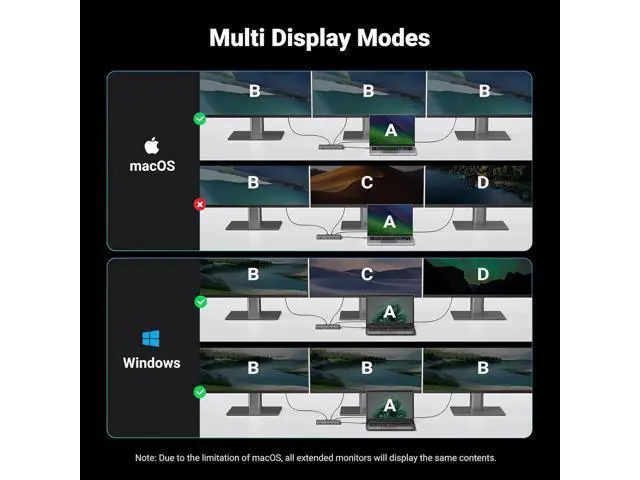 Triple-Monitor Display: Support up to 4K triple-screen display. Support single and dual-monitor displays up to 4K@60Hz. Please note that due to MacOS limitations, all extended monitors will display the same content when connecting a MacBook. Start the