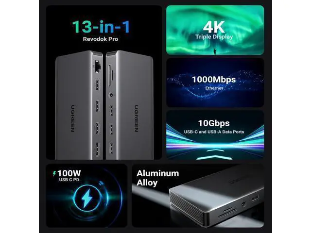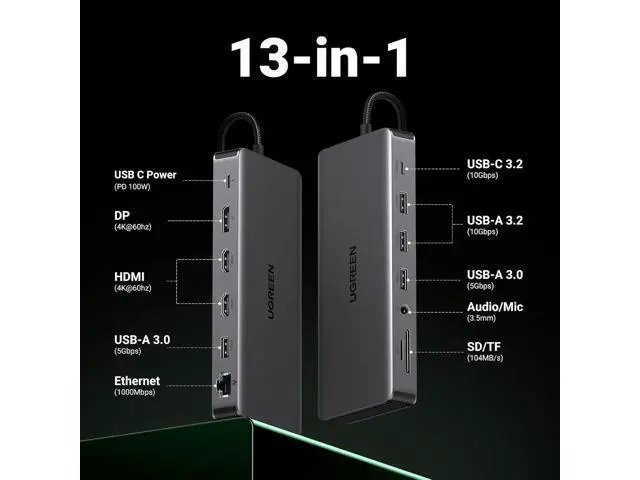 USB C Docking Station: Inspire more potential of your laptops USB-C port with Two HDMI ports, a DisplayPort, a 10 Gbps USB-C 3.2 Gen 2 port, two 10 Gbps USB-A 3.2 Gen 2 ports, two USB A 3.0, 100W Power Delivery, RJ45 3.5MM and SD/Micro SD card reader.