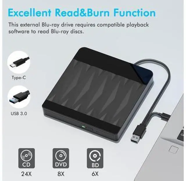 [High-Speed Read & Burn Function] - Since there is a 2-in-1 cable (USB 3.0 &Type-C) embedded in the back of the blu ray burner, whether the port of your laptop/desktop belongs to USB A or USB C, you can use this external blu ray drive without limitation. Moreover, with this blu-ray cd dvd drive for pc, you can enjoy maximum write/read speeds of 6x for Blu-ray, 8x for DVDs, and 24x for CDs, and enjoy the data transfer rates of up to 5Gbps. ^^ [Support 50G Disc Read/Write] - If you want an external blu ray burner to install software, data backup, watch movies, play games, listen to music, burn/read CD/DVD/BD, this usb c blueray/dvd/cd burner which supports 50G capacity will satisfy your need to achieve that.