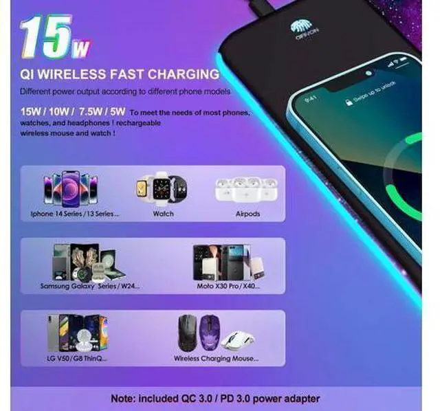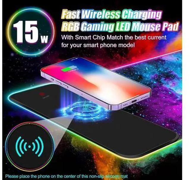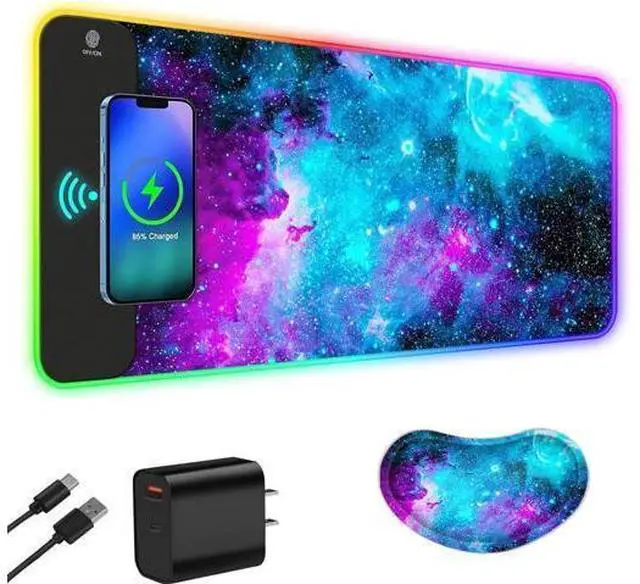 15W QI Wireless Charging Mouse pad + 30W PD charger The Large Mouse pad Built-in 15W wireless fast charging, which comes with a 30W PD charger and a 6.5 ft PD 5A fast charging cable. This wireless charging mouse pad supports all QI wireless charging devices. such as Compatible with iPhone 8/X/XR/XS/11/11 Pro/12/12 Pro/12 pro max/13/13 Pro/13 pro max, iPhone 14 / 14 Pro, Compatible with Galaxy 10/S9/S8 Plus, Galaxy Note 9/8, Galaxy Buds and so on Large RGB Gaming Mouse Mat + Wrist rest The 31.5X 11.8 Inch XXL mouse pad is large enough to fit your keyboard, phone and mouse, leaving enough room to move your mouse around as much as you wish.