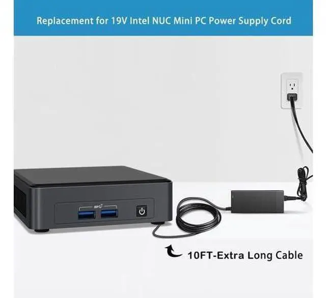 Output: 19V 6.32A 120-Watt, Also Compatible with 19v 4.74 a 90w. Positive Tip; Free Extra Long AC Cable Include. Total Intel NUC Power Cord Length 10FT. ^^ Safety SecurityOur mini pc power cord are UL / FCC / CE / Rohs Certified, which in compliance with top industry standards. Our adapter was made with the highest quality and the newest materials. V-0 grade flame retardant, Ovp, Ocp, Scp