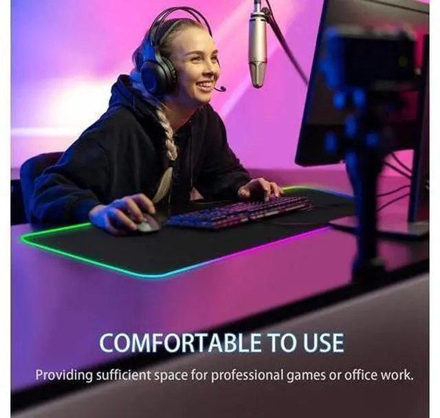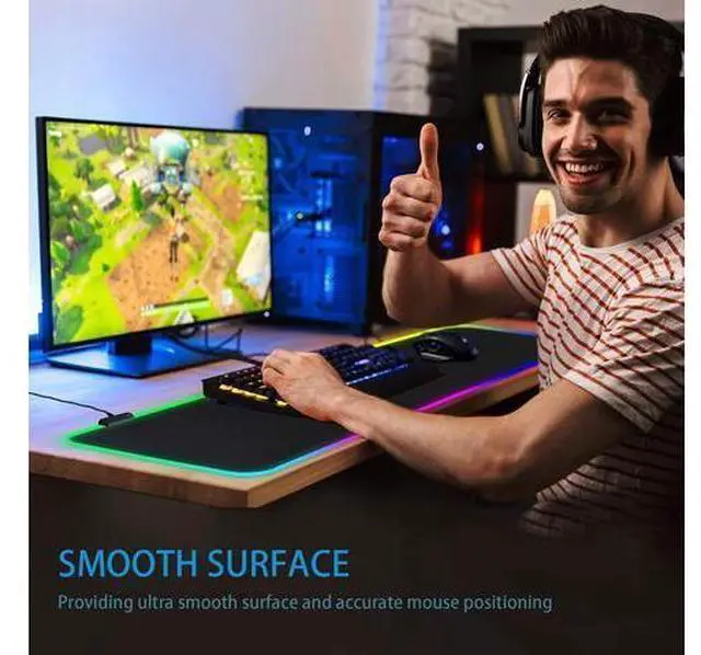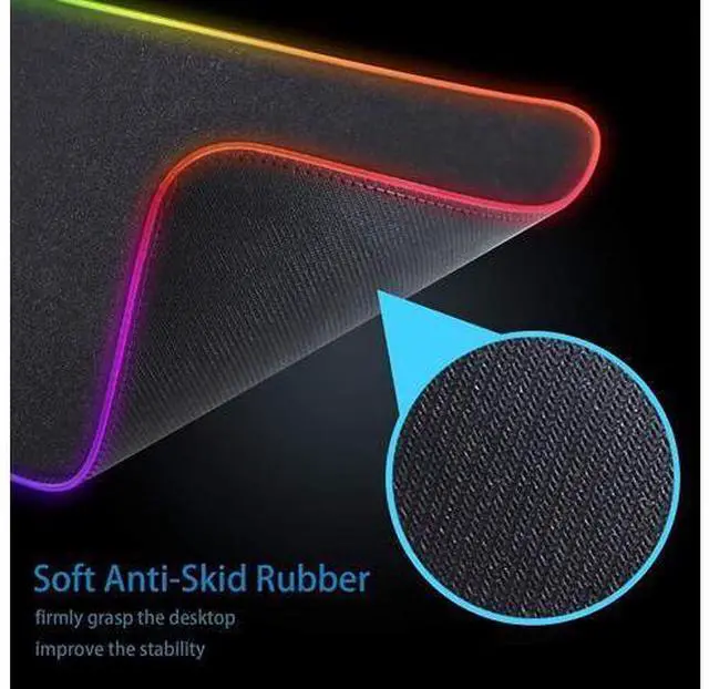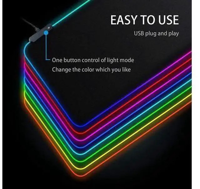 USB PLUG AND PLAY, EASY TO USE The extended mouse pads is powered by USB, plug and play, easy to use. One button control of light mode. Press once to change the lighting mode, twice to change the brightness of the mouse pad, press and hold for about 3 seconds to turn on / off. Than get a beautiful led mouse pad. Micro Textured Cloth Surface the surface of the big mouse pad is made of superfine fiber woven material, providing ultra smooth surface and accurate mouse positioning. NON-Slip Rubber Base The bottom of the RGB Gaming Mouse Pad is made of soft anti-skid rubber, which can firmly grasp the desktop and improve the stability.
