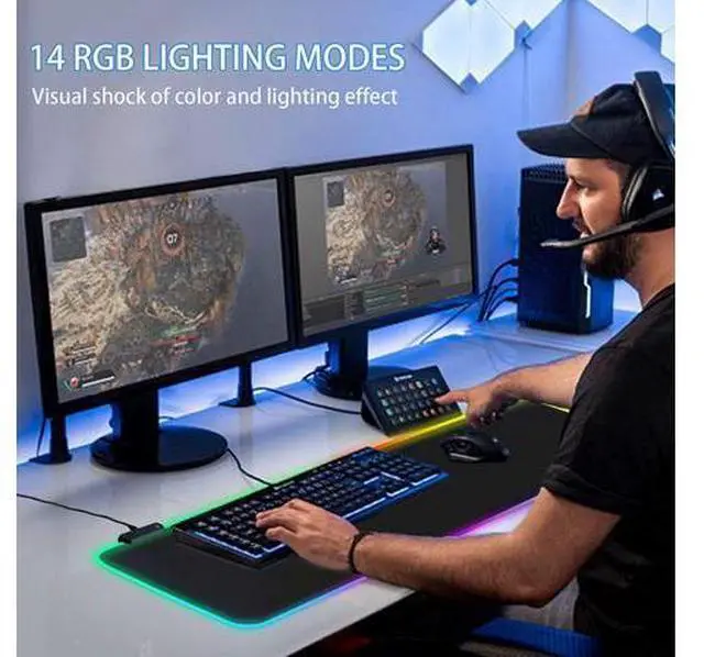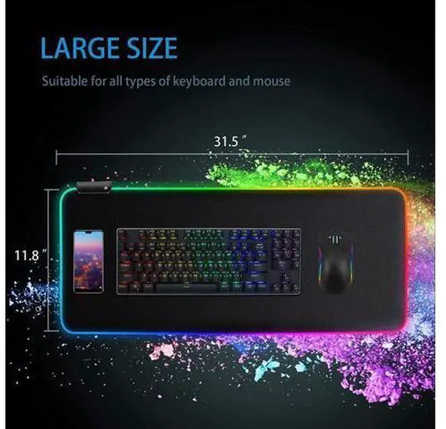 14 RGB Lighting Modes You can choose from 14 lighting modes. Including red, blue, green, purple, cyan, yellow, orange and breathing lights. The mouse pad with visual shock of color and lighting effect. Large Mouse Pad for professional games or office work. The mouse pads for wireless mouse, gaming keyboard is suitable. Very comfortable when the wrist touches the surface, Best idea for game or work. The large mouse pads can be easily cleaned with water for continuous use if you spill the coffee, cola, or juice on it by accident.