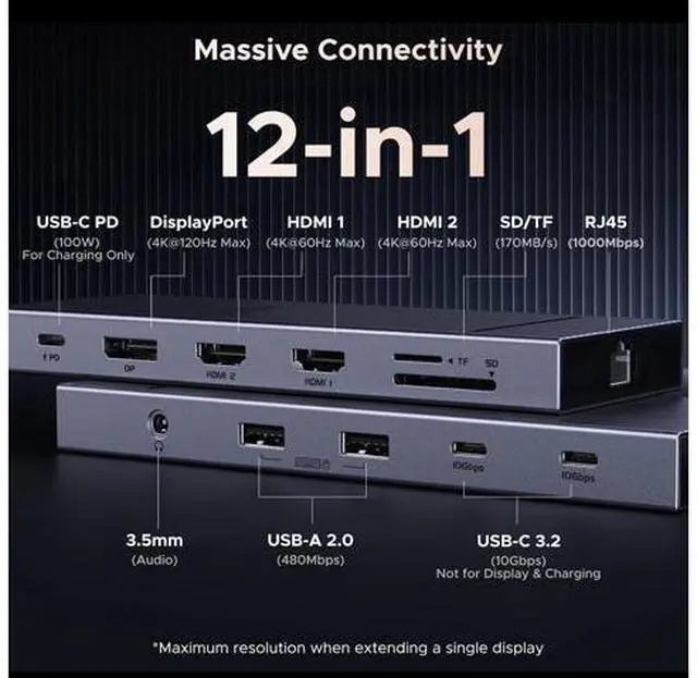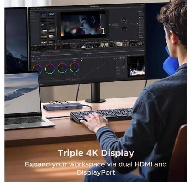 Resolution Docking Station: With 2 HDMI and 1 DP port, this docking station supports single-screen 4K 144Hz, dual-screen 4K 60Hz, and triple-screen 4K 30Hz ultra-clear resolution for enhanced work and entertainment.