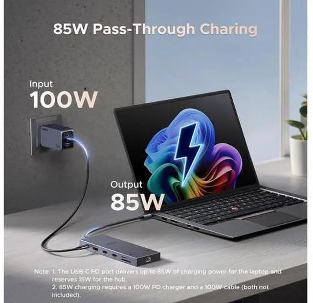 100W Power Delivery: Supports up to 85W USB-C pass-through charging for your laptop, reserving 15W for other port operations. The port only supports charging and does not facilitate data transfer or video output.