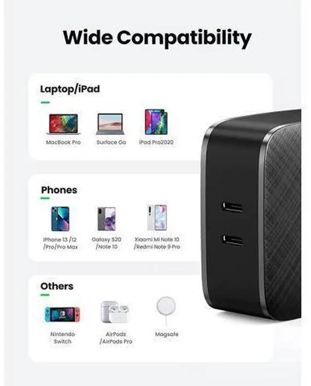 Widely Compatibility: PD charger is compatible with MacBook Pro/MacBook Air, HP, Samsung Galaxy S21/S21+/S20/S10/Note 20/Note 10, AirPods, iPhone 13/13 Pro/13 Mini/13 Pro Max/12 Mini/12/12 Pro/12 Pro Max/SE/iPhone 11/11 Pro/11 Pro Max/XR/XS/8, iPad Pro, Google Pixel, Switch, Oculus Quest 2 and more.