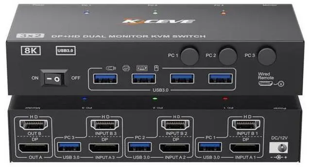 HDMI and Displayport KVM Switch Dual monitorThis 2 monitors KVM switch allows you to effortlessly manage 3 computers to share 2 monitors and 4 USB devices together. You can choose expanded mode and copy mode between two monitors as required,the extended mode can output two different screens and the mirror mode can output two identical screens.