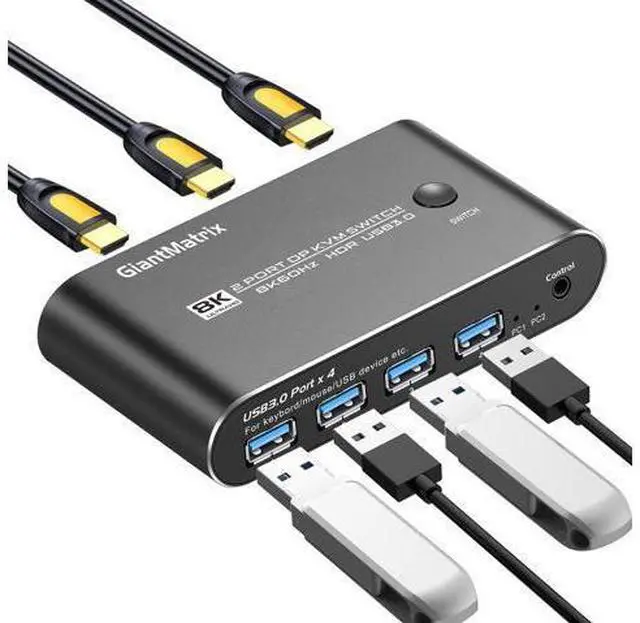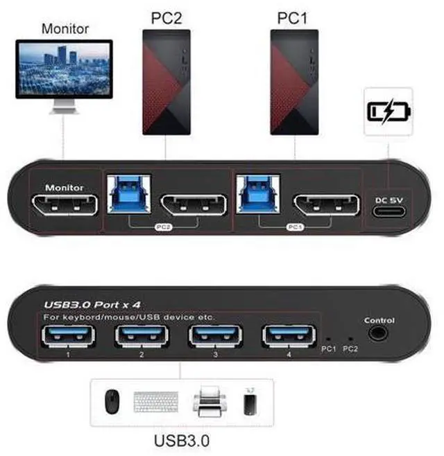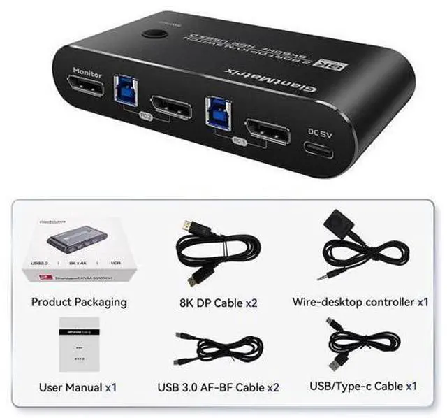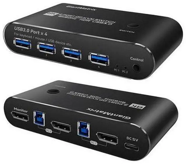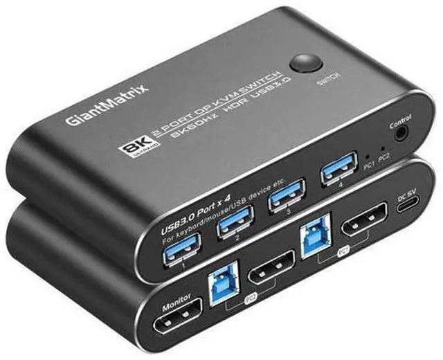 2 Port KVM Displayport: KVM Switch Displayport 2 Computers 1 Monitor sharing one set of keyboard & mouse, 1 DP 2.0 or DP 1.4 monitor, and 2 pcs USB 3.0 peripheral devices. 2 pcs USB 3.0 hub (data transferring rate up to 5Gbps/s, 10 times faster than USB 2.0 ), 2 kits cables and a wire remote push button switch. 2. Displayport KVM Switch 2