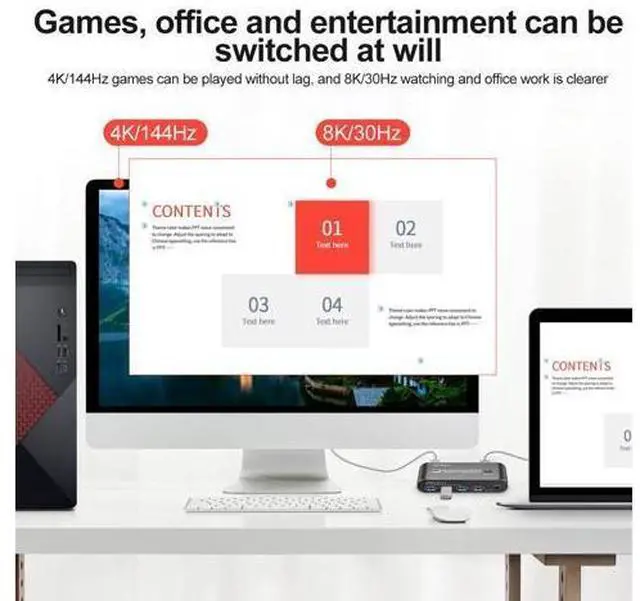 Port: Support long DP 1.4 Cables, The kvm switch Displayport has EQ, Support long DP 1.4 Cables 4k 144Hz 2K165Hz 1440P 120Hz 144Hz 165Hz 175Hz 240Hz, DP input 1.5M, DP Output 1.5M For RTX3060, RTX3070, RTX3080, RTX3090, RTX4080Support FreeSync G-SYNC 5, Attention, The 2 Port Kvm Switch Displayport cannot support USB-C to DP Cable. The kvm Displayport cannot support EDID. The Displayport Kvm Switch cannot support laptop(USB-C Output).. The kvm switch cannot support DP TO HDMI output. It cannot support HDMI TO DP, too. It must use DP 1.4 Cables, and use the accessory cable for output. It can not support Dock (Docking) and other Devices which is Type-c output