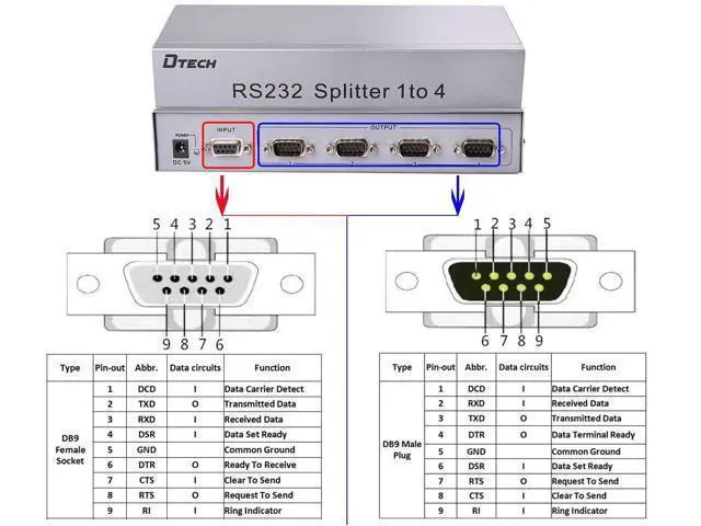• RS232 Splitter, DTECH 4 Port Serial Expansion Box 1x4 COM Port Expander with Power Adapter for Sharing PCs and Capture Data