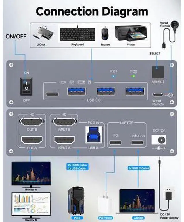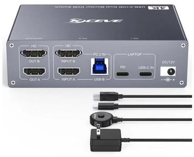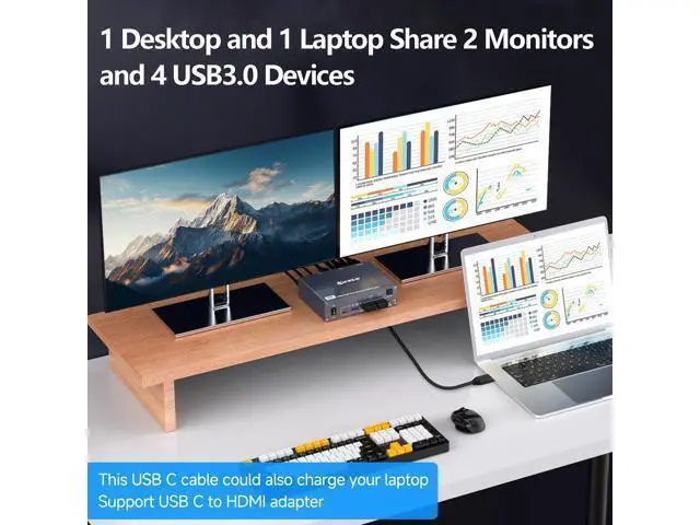 USB C HDMI KVM SwitchUSB C KVM Switch Dual Monitor allows you to use 1 set of mouse, keyboard to control 1 laptop and 1 computer, compatible printer, scanner, webcam, each computer is displayed on 2 HDMI monitors. KVM Switch USB C 2 computer is the first choice for office and home