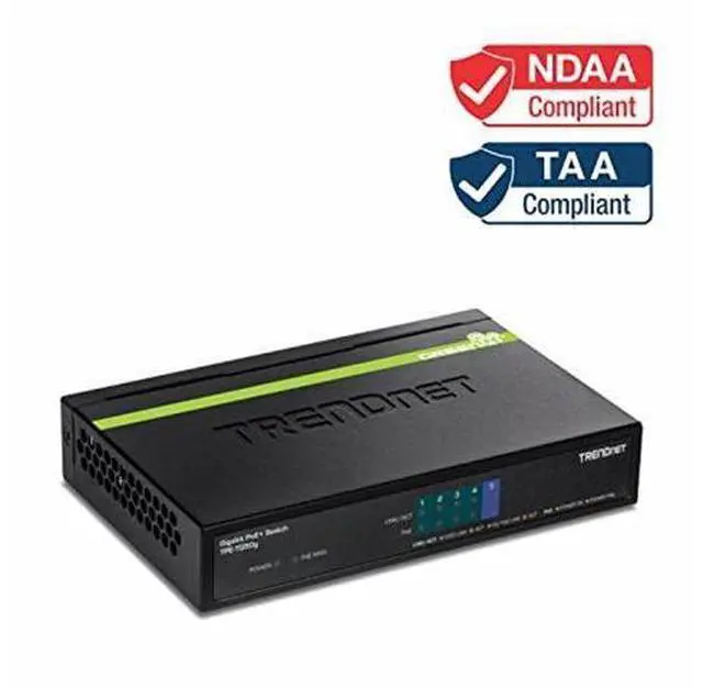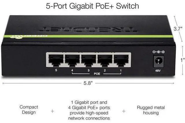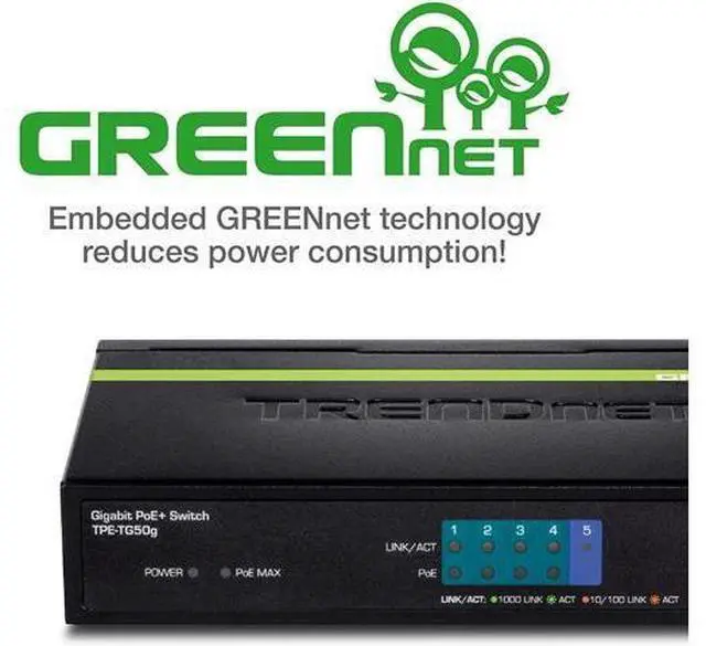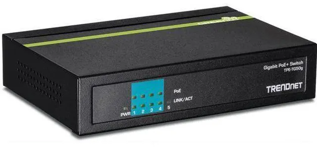 TRENDnets 5-Port Gigabit PoE+ Switch, model TPE-TG50g, delivers data and power over existing Ethernet cables to Power over Ethernet (PoE) devices, such as access points and IP cameras. It supports both PoE and PoE+ devices with a 31W PoE power budget. Easily install this compact sturdy metal switch for reliable high-speed PoE networking.