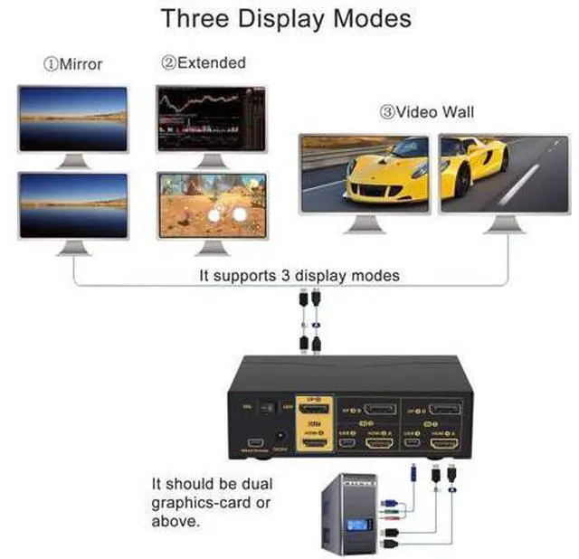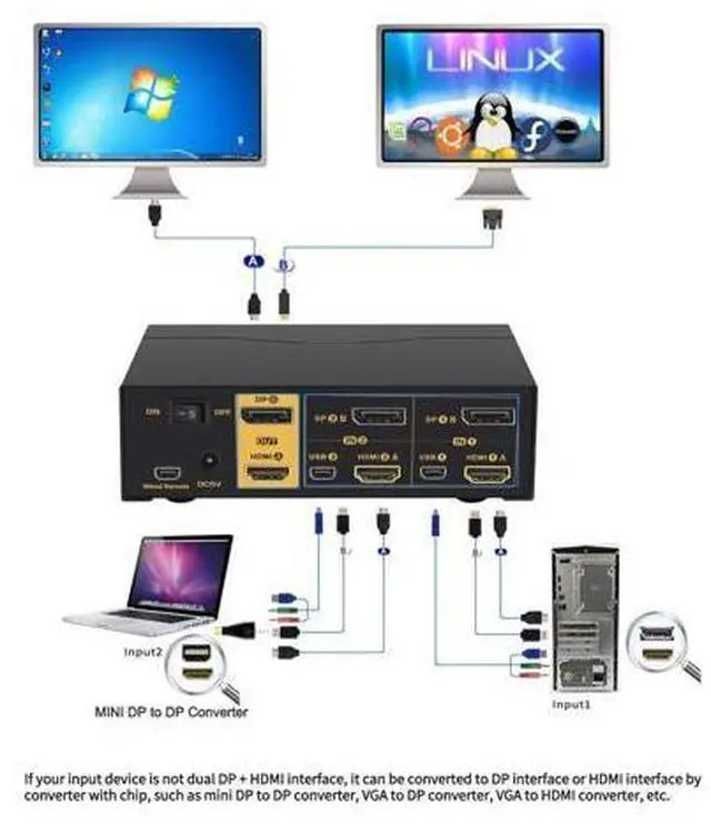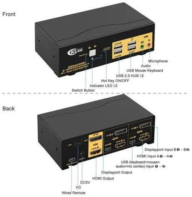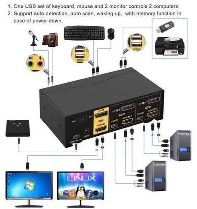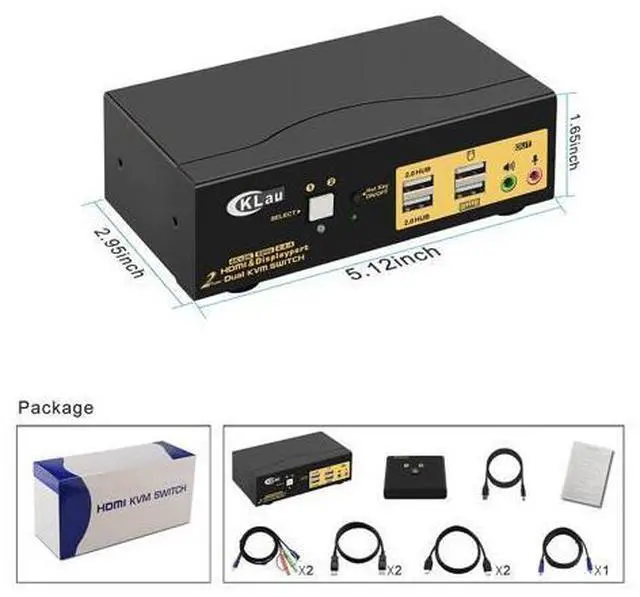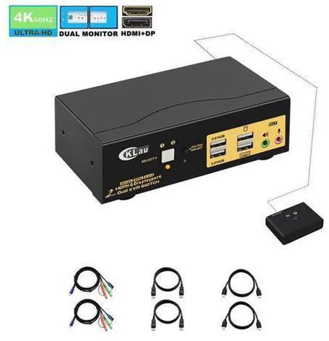 KVM Switch with HDMI + Displayport: one set of keyboard, mouse and 2 monitors controls 2 HDMI+displayport computers/laptops. With audio and mic output, 2 pcs USB 2.0 HUB, 2 kits cables and a wire remote control push button switch. (Tips: it is DP1.2 60Hz version for displayport port, it doesn't compatible DP1.4 version, 100Hz, 120Hz, 144Hz devices)