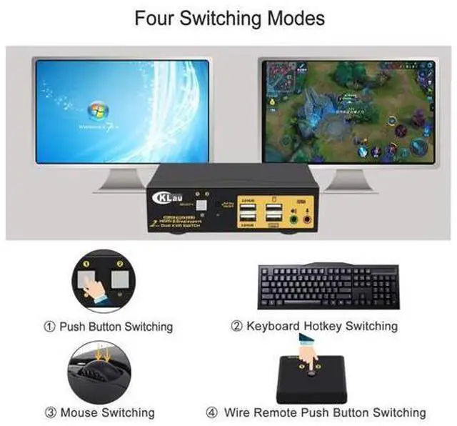 Support Four Switching Mode: manual button switching, mouse switching, keyboard hot-key switching and wire remote push button switching. Support the devices which even without USB signal input.