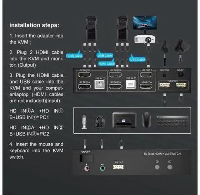 Support 2 switching modes: Buttons switch and wired remote; 7. The ports that need to plug in HDMI/USB cables are all hidden behind the KVM, so the desktop doesn't get cluttered; How to connect? 1. Insert the power adapter into the dual monitor KVM switch; 2. Plug the HDMI cable into the KVM and monitor; (Output) 3. Plug the HDMI cable and USB cable into the KVM and your computer/laptop (HDMI cables are not included) (Input) HD INA + HD IN B + USB IN=PC1 HD INA + HD IN B + USB IN=PC2 4. Insert the mouse and keyboard into the KVM switch 5. If needed, you can connect a microphone and audio port 6. You can switch by press the switch button or wired remote.