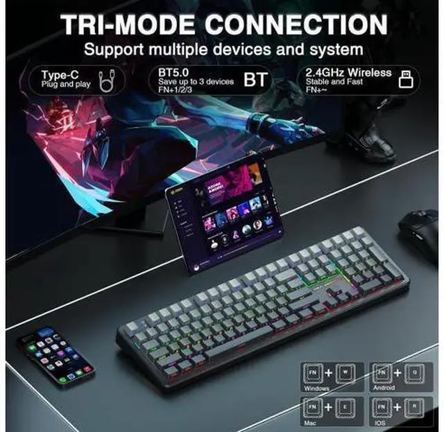 Mechanical Keyboard: The AULA F108 mechanical gaming keyboard supports BT 5.0, 2.4GH z wireless and USB-C wired connectivity which can save up to five devices. The BT 5.0 mode allows for quick switching between pc, mac, laptop and tablets while the 2.4GH z wireless and USB-C wired mode with a polling rate of 1000Hz ensures highly competitive stability and responsiveness. The creamy keyboard with number pad is compatible with Windows, Mac, IOS and Android operating systems, and you can easily switch systems with shortcut keys(Note: In Linux systems, incompatible driver versions may cause abnormal F-zone functionality, which is a normal phenomenon. Please rest assured to use it)