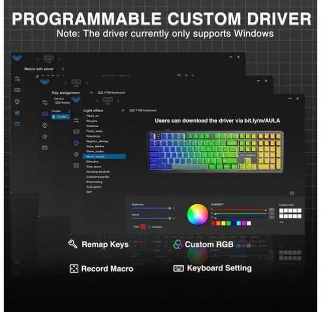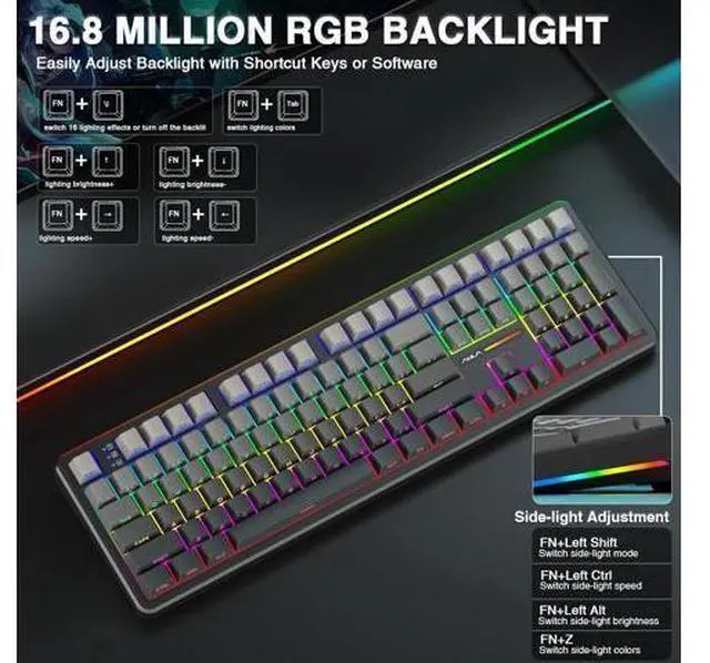 Programmable Software: The rgb backlit keyboard supports multiple dynamic RGB effects, monochrome and multi-colour modes. Over 16.8 million RGB colors are available to suit your mood, occasion or overall aesthetic. The decorative light bars on both sides are colorful and add a strong gaming atmosphere. RGB effects and colors can be switched through the shortcut keys or software. With the F108 driver, all keys support macro customization, which allows to record and edit macros to improve your work efficiency and speed up gameplay.