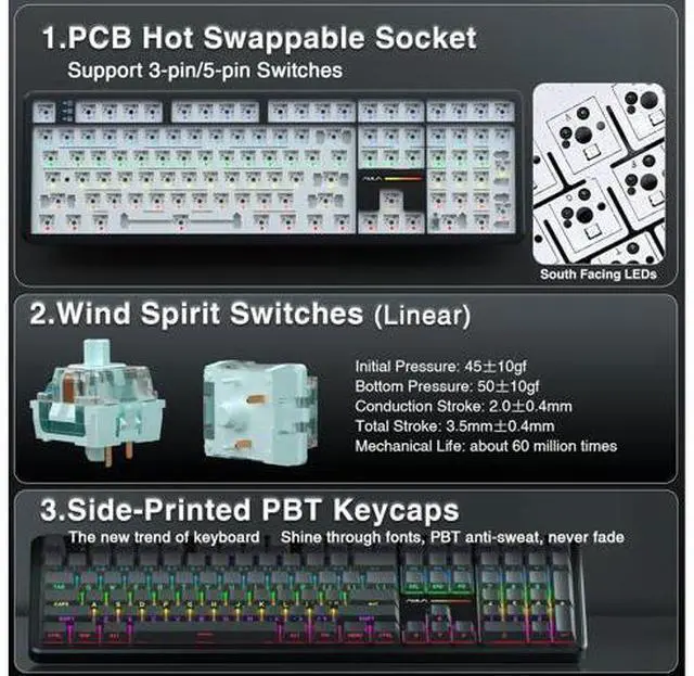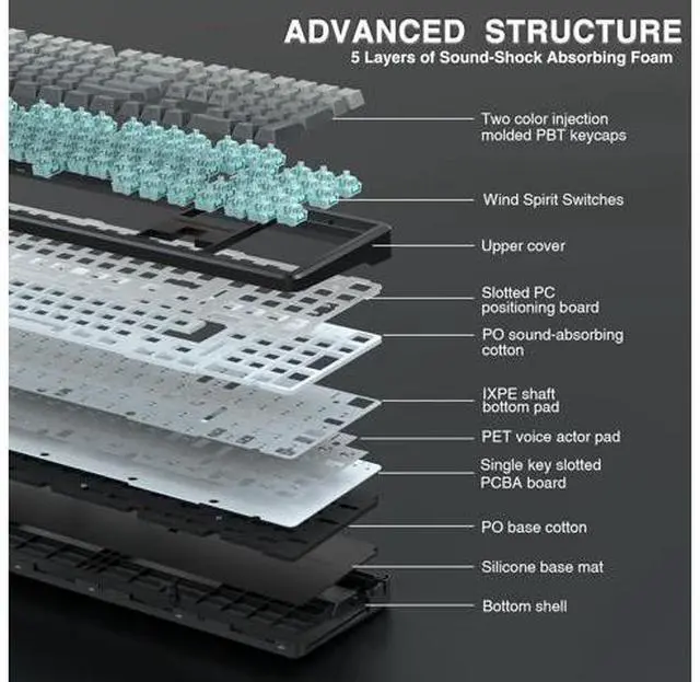 Hot-swappable Custom Keyboard: AULA F108 wireless mechanical keyboard comes with a hot-swappable base that is compatible with 3-pin or 5-pin switches. Without the soldering process, users can easily replace switches and keycaps to customize their keying experience (keycap/switch puller is included in the package). Equipped with pre-lubricated stabilizers and switches, the creamy keyboard bring smooth typing feeling and pleasant creamy mechanical sound, providing fast response for exciting games Advanced Five Layers