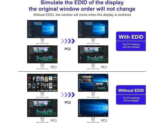 Support Simulation EDID: This kvm switches can simulate the EDID of the display, store the resolution and refresh rate of the display.