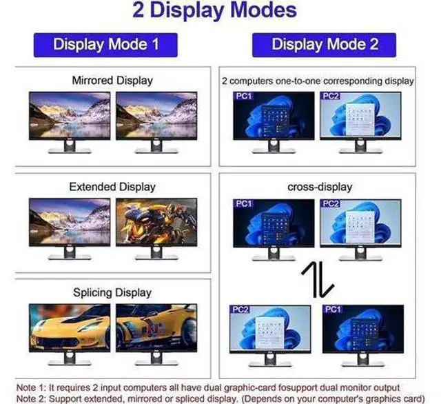 Multiple Display Methods: Dual monitors offer more than just output expansion, mirroring, and splicing modes; they also enable cross-display functionality between 2 PCs.