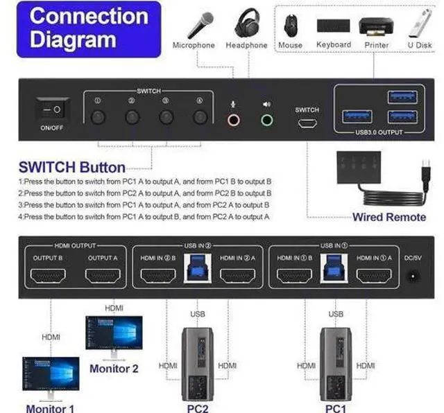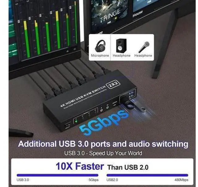 Note: Only when both your computer Graphics card and monitor support 4K@60Hz then you can get 4K@60Hz effect, so if you want the max resolution you have to check your devices first. 2 PCs Share 3 USB 3.0 Devices 3 USB 3.0 ports, backward compatible with USB 2.0 and USB 1.1, share USB devices such as keyboard mouse scanner, printer, flash drive, etc. Headphone Jack and Microphone Jack KVM Switch comes with a 3.5 mm Audio Jack port with a DAC chip inside, which can be inserted into a 3-segment 3.5 mm earpiece device, and a 3.5 mm microphone interface, which can be inserted into a 3-segment microphone.